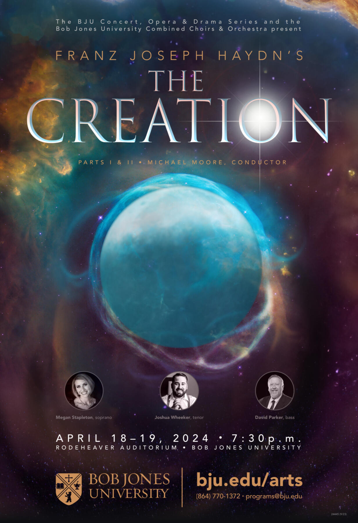 Under the baton of Dr. Michael Moore, BJU Artist Series presents Haydn’s glorious cinematic-like oratorio, The Creation, featuring soloists Megan Stapleton (soprano), Joshua Wheeker (tenor), and David Parker (bass).
