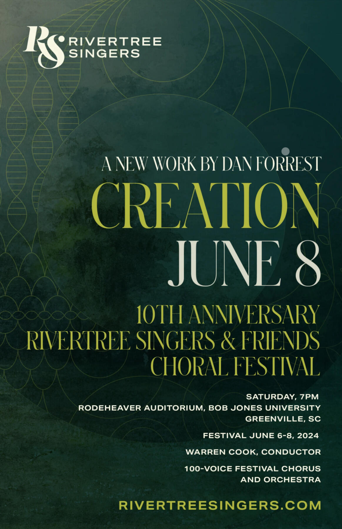 Celebrating the ensemble’s 10th Anniversary, Dr. Warren Cook and his Rivertree Singers bring Dan Forrest’s Creation to Greenville, South Carolina. Reprising their April performance at Lincoln Center with Megan Stapleton and Troy Castle as the soprano and baritone soloists, this concert will be held in Greenville’s beautiful Rodeheaver Auditorium on the campus of Bob Jones University. Dan Forrest’s exquisite oratorio is a rare gem of musical beauty, certainly a work not to be missed!