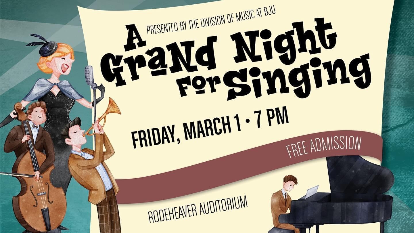 Featuring the BJU Symphony Orchestra and student and faculty vocal soloists under the direction of Maestro Michael Moore, BJU presents “A Grand Night for Singing,” an evening of opera and musical theatre favorites.